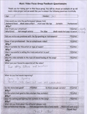 This is an audience feedback questionnaire. In class we filled out a sheet for other groups music videos, they give you a good opinion of posotives and negatives about your music video. They highight key areas that might need improving and bits that they like the most.